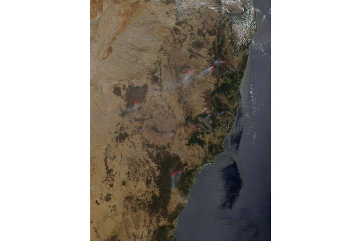 Fires in New South Wales, Australia region: Au sat: Terra projection: Sinusoidal projection center lon: 151 image center lon: 151 image center lat: -31.5 UL lon: 147.9483 UL lat: -27.9048 LR lon: 154.2990 LR lat: -35.0994