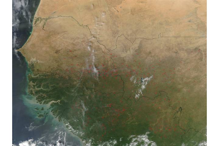 Fires in Western Africa (afternoon overpass) region: Af Senegal Gambia Guinea Mali Mauritania sat: Aqua projection: Plate Carree projection center lon: -12.2 image center lon: -12.2 image center lat: 13.5 UL lon: -17.6780 UL lat: 17.5469 LR lon: -6.7197 LR lat: 9.4530