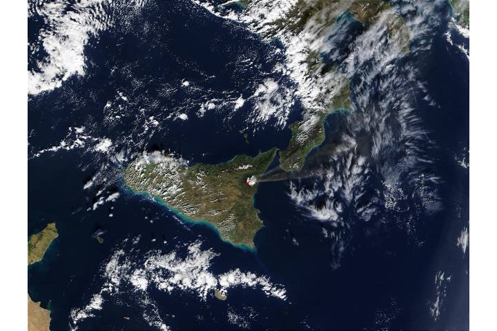 Eruption of Mt. Etna in Sicily region: Eu volcano ash Italy sat: Terra projection: Sinusoidal projection center lon: 15.5 image center lon: 15 image center lat: 38 UL lon: 10.2378 UL lat: 40.6976 LR lon: 19.4271 LR lat: 35.3017