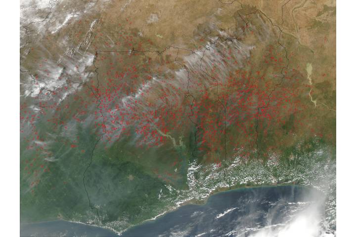 Fires in West Africa(afternoon overpass) region: Af Ivory Coast Cote D'Ivoire Ghana Togo Benin Nigeria Burkina Faso sat: Aqua projection: Sinusoidal projection center lon: 0 image center lon: 0 image center lat: 8.7 UL lon: -5.5311 UL lat: 12.7467 LR lon: 5.4149 LR lat: 4.6529 Contact: Jacques Descloitres