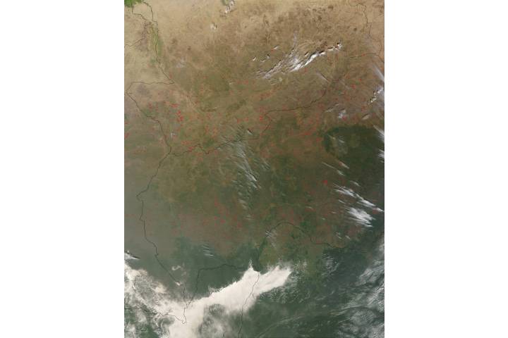 Fires in Central Africa(morning overpass) region: Af Chad Central African Republic sat: Terra projection: Sinusoidal projection center lon: 18.5 image center lon: 18.5 image center lat: 7 UL lon: 13.8892 UL lat: 12.8434 LR lon: 22.9986 LR lat: 1.1523 Contact: Jacques Descloitres