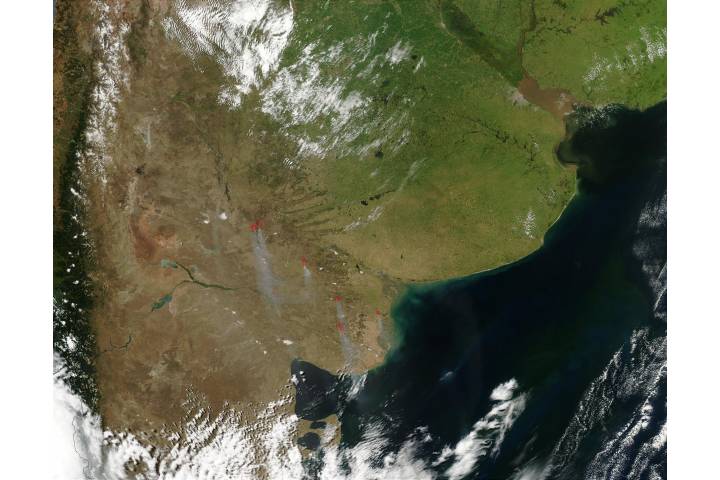 Fires in Argentina(afternoon overpass) region: SA Uruguay sat: Aqua projection: Sinusoidal projection center lon: -63 image center lon: -63 image center lat: -38 UL lon: -71.5179 UL lat: -32.3812 LR lon: -53.0598 LR lat: -43.6227 Contact: Jeff Schmaltz