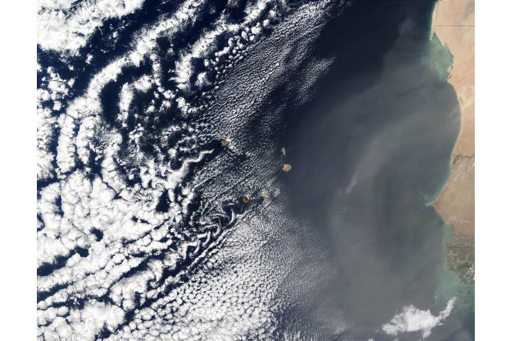 Vortex street and dust off Cape Verde Islands region: AF AT cloud von karman sat: Terra projection: Sinusoidal projection center lon: -24 image center lon: -24 image center lat: +16 UL lon: -32.7465 UL lat: +22.2930 LR lon: -15.7875 LR lat: +9.7025 Contact: Jeff Schmaltz