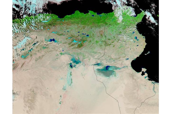 Floods in Tunisia and Algeria(false color) region: Af sat: Aqua projection: Sinusoidal projection center lon: +7 image center lon: +7 image center lat: +34.5 UL lon: +1.8903 UL lat: +37.6467 LR lon: +11.7402 LR lat: +31.3514 Contact: Jacques Descloitres