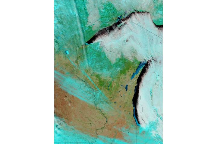 Snow and ice in Wisconsin(false color) region: NA United States Michigan Minnesota Iowa Illinois Canada sat: Aqua projection: Plate Carree projection center lon: -90 image center lon: -90 image center lat: +45 UL lon: -94.7678 UL lat: +49.4952 LR lon: -85.2290 LR lat: +40.5020 Contact: Jacques Descloitres