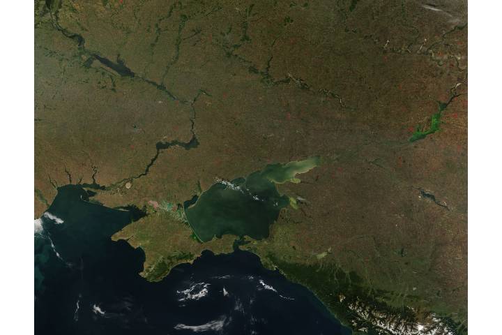 Ukraine and southwest Russia region: Eu sat: Terra projection: Plate Carree projection center lon: +37.0000 projection center lat: +47.0000 image center lon: +37 image center lat: +47 UL lon: +30.0065 UL lat: +50.8217 UR lon: +43.9967 UR lat: +50.8217 LR lon: +43.9967 LR lat: +43.1775 LL lon: +30.0065 LL lat: +43.1775 UL easting (km): -549.8750 UL northing (km): +5651.1250 x scale factor: +0.7071067811865476 ellipsoid: WGS84 Contact: Jeff Schmaltz L2 granules: T042630830 T042630835