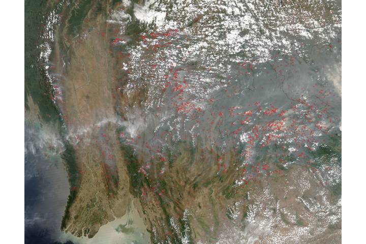 Smoke and Fires in Southeast Asia region: As Myanmar Thailand China Laos sat: Aqua projection: Plate Carree projection center lon: +99.0000 projection center lat: +20.0000 image center lon: +99 image center lat: +20 UL lon: +92.7805 UL lat: +24.4964 UR lon: +105.2219 UR lat: +24.4964 LR lon: +105.2219 LR lat: +15.5032 LL lon: +92.7805 LL lat: +15.5032 UL easting (km): -649.8750 UL northing (km): +2723.8750 x scale factor: +0.9396926207859084 ellipsoid: WGS84 Contact: Jeff Schmaltz L2 granules: A050890650