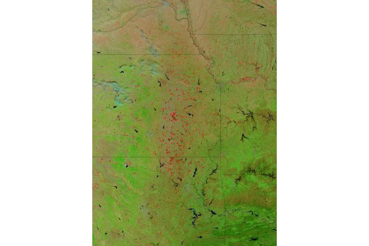 Fires and burn scars in central United States(false color) region: NA Nebraska Kansas Oklahoma Iowa Missouri Arkansas sat: Terra projection: Plate Carree projection center lon: -96.0000 projection center lat: +38.0000 image center lon: -96 image center lat: +38 UL lon: -99.5205 UL lat: +41.5969 UR lon: -92.4766 UR lat: +41.5969 LR lon: -92.4766 LR lat: +34.4024 LL lon: -99.5205 LL lat: +34.4024 UL easting (km): -299.8750 UL northing (km): +4625.3750 x scale factor: +0.7660444431189780 ellipsoid: WGS84 Contact: Jeff Schmaltz L2 granules: T050921720 T050921725