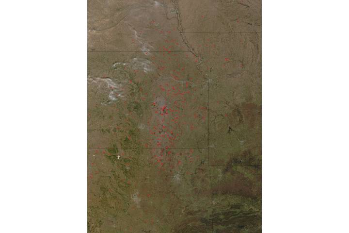 Fires and burn scars in central United States(true color) region: NA Nebraska Kansas Oklahoma Iowa Missouri Arkansas sat: Terra projection: Plate Carree projection center lon: -96.0000 projection center lat: +38.0000 image center lon: -96 image center lat: +38 UL lon: -99.5205 UL lat: +41.5969 UR lon: -92.4766 UR lat: +41.5969 LR lon: -92.4766 LR lat: +34.4024 LL lon: -99.5205 LL lat: +34.4024 UL easting (km): -299.8750 UL northing (km): +4625.3750 x scale factor: +0.7660444431189780 ellipsoid: WGS84 Contact: Jeff Schmaltz L2 granules: T050921720 T050921725