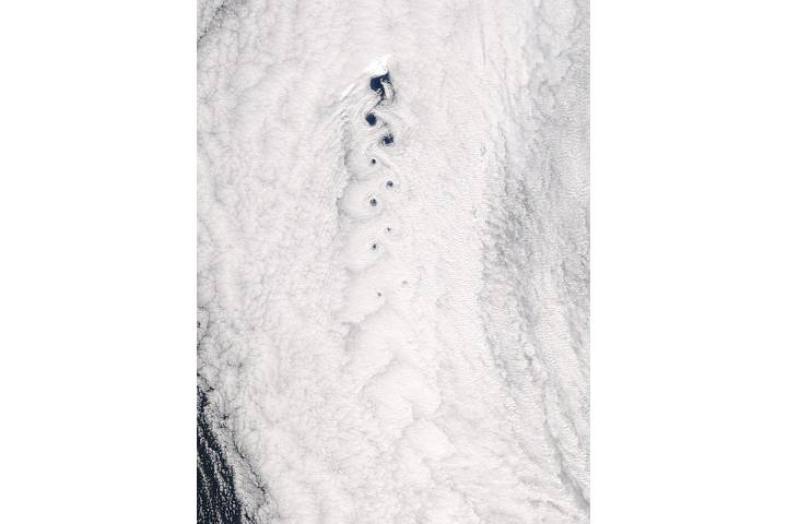 Cloud vortices off Jan Mayen Island, Greenland Sea region: Ar Eu von karman vortex sat: Aqua projection: Lambert Azimuthal projection center lon: -10.0000 projection center lat: +90.0000 image center lon: -8 image center lat: +69.7 UL lon: -12.0068 UL lat: +71.5256 UR lon: -3.6252 UR lat: +71.4211 LR lon: -4.6619 LR lat: +67.7848 LL lon: -11.6786 LL lat: +67.8728 UL easting (km): -71.6250 UL northing (km): -2044.1250 ellipsoid: Sphere Earth radius (km): 6371.007181 Contact: Jeff Schmaltz L2 granules: A051361255