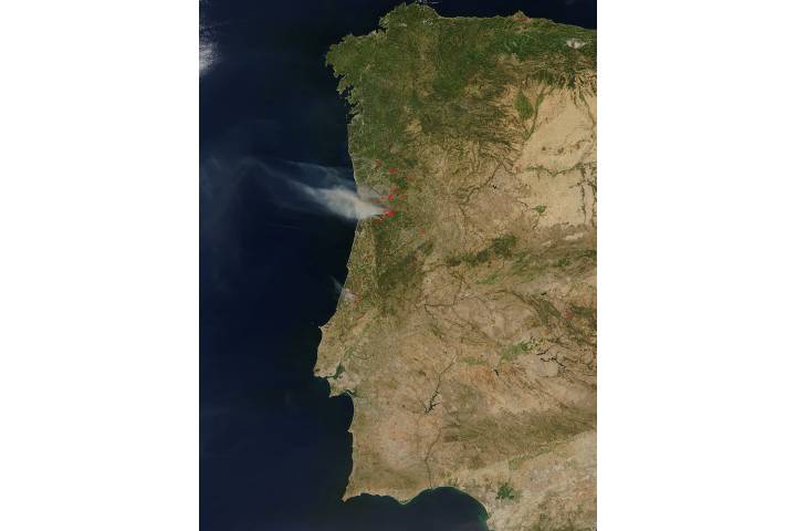 Fires in Portugal region: Eu Spain sat: Terra projection: Plate Carree projection center lon: -8.0000 projection center lat: +40.2000 image center lon: -8 image center lat: +40.2 UL lon: -11.5205 UL lat: +43.7958 UR lon: -4.4766 UR lat: +43.7958 LR lon: -4.4766 LR lat: +36.6012 LL lon: -11.5205 LL lat: +36.6012 UL easting (km): -299.8750 UL northing (km): +4869.8750 x scale factor: +0.7660444431189780 ellipsoid: WGS84 Contact: Jeff Schmaltz L2 granules: T052161110