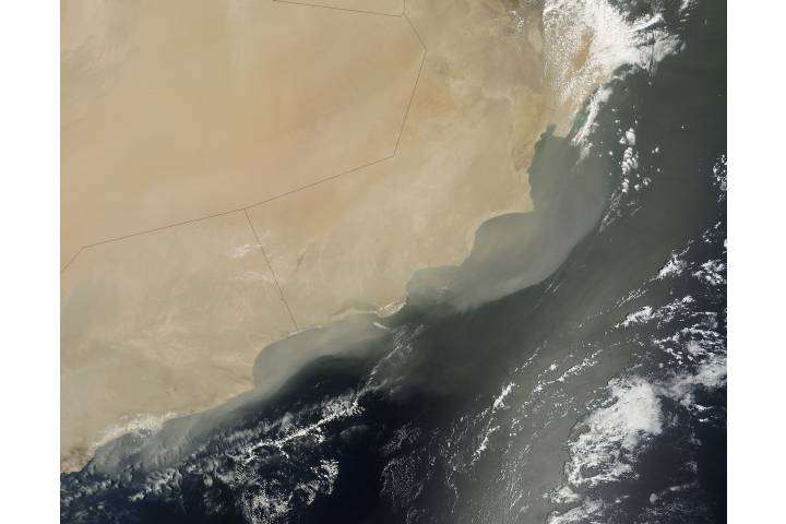 Dust storm off the Arabian Peninsula region: As Yeman Oman sat: Terra projection: Plate Carree projection center lon: +55.0000 projection center lat: +18.0000 image center lon: +55 image center lat: +18 standard parallel: +20.0000 UL lon: +48.3019 UL lat: +22.9450 UR lon: +61.7005 UR lat: +22.9450 LR lon: +61.7005 LR lat: +13.0525 LL lon: +48.3019 LL lat: +13.0525 UL easting (km): -699.8750 UL northing (km): +2551.3750 x scale factor: +0.9396926207859084 ellipsoid: WGS84 Contact: Jeff Schmaltz L2 granules: T130970650 T130970655