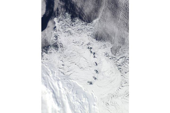 Sea ice surrounding the South Sandwich Islands region: At An sat: Terra projection: Plate Carree projection center lon: -28.0000 projection center lat: -57.0000 image center lon: -28 image center lat: -57 standard parallel: -50.0000 UL lon: -33.9444 UL lat: -52.0538 UR lon: -22.0521 UR lat: -52.0538 LR lon: -22.0521 LR lat: -61.9463 LL lon: -33.9444 LL lat: -61.9463 UL easting (km): -424.8750 UL northing (km): -5788.1250 x scale factor: +0.6427876096865394 ellipsoid: WGS84 Contact: Jeff Schmaltz L2 granules: T162421120