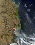 News reports from New South Wales, Australia, indicate that fire danger is high across the region and that as of October 7, 2002, 70 fires were burning across the state, 20 of which were out of control. These true-color Moderate Resolution Imaging Spectroradiometer (MODIS) images were acquired by the Terra and Aqua MODIS instruments beginning on October 8, 2002, and show numerous fires (red dots) and heavy smoke, especially along the coast between Brisbane and Sydney. The fires burning in Sydney’s suburbs have already destroyed 10 homes. Fires continued to burn throughout the fall and into winter 2003.