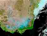 According to news reports, more than 70 bushfires were burning across New South Wales, Australia, as of January 10, 2003. Another 20 large fires were burning to the south in Victoria. These true- and false-color Moderate Resolution Imaging Spectroradiometer (MODIS) images from the Terra and Aqua satellites show the fires marked with red. Initially, the heaviest concentration of fires was located in the Great Dividing Range Mountains in Kosciuszko National Park in southern New South Wales. Over subsequent weeks, the fires became most severe in northeast Victoria, to the south. Gusty winds and high temperatures hampered containment efforts, and the smoke created a significant health hazard.