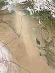 A bright band of dust sweeps down the center of ancient Mesopotamia in this Moderate Resolution Imaging Spectroradiometer (MODIS) image, collected on April 19, 2005, by NASA’s Aqua satellite. The dust is blowing north out of the Syrian Desert in Iraq and Syria. Though the color matches the ground, the airborne dust is brighter and smoother in texture, making it stand out in the image. The dust blankets the land between the Euphrates River on the east and the Tigris River in the west—the region that nurtured some of the earliest human civilizations. Today, a green band of vegetation makes the Euphrates River easy to see in modern Syria. On the right side of the image, the Tigris is also lined in green as it flows through eastern Iraq. MODIS detected three fires to the east of the Tigris, and they are marked with red dots in this image.