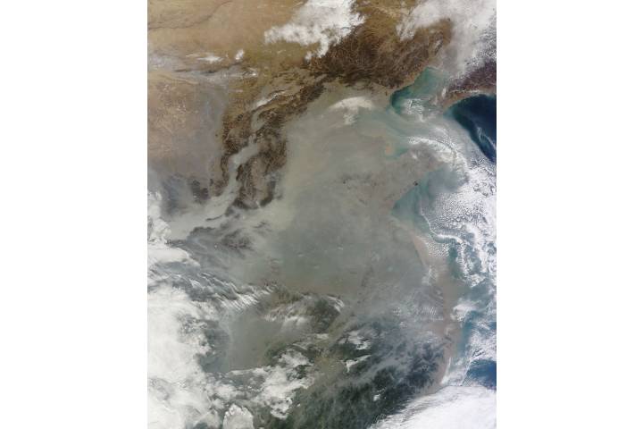 Haze over eastern China region: As sat: Terra projection: Plate Carree projection center lon: +116.0000 projection center lat: +35.0000 image center lon: +116 image center lat: +35 standard parallel: +35.0000 UL lon: +107.4929 UL lat: +43.5417 UR lon: +124.5098 UR lat: +43.5417 LR lon: +124.5098 LR lat: +26.4546 LL lon: +107.4929 LL lat: +26.4546 UL easting (km): -774.8750 UL northing (km): +4841.6250 x scale factor: +0.8191520442889918 ellipsoid: WGS84 Contact: Jeff Schmaltz L2 granules: T133570300 T133570305